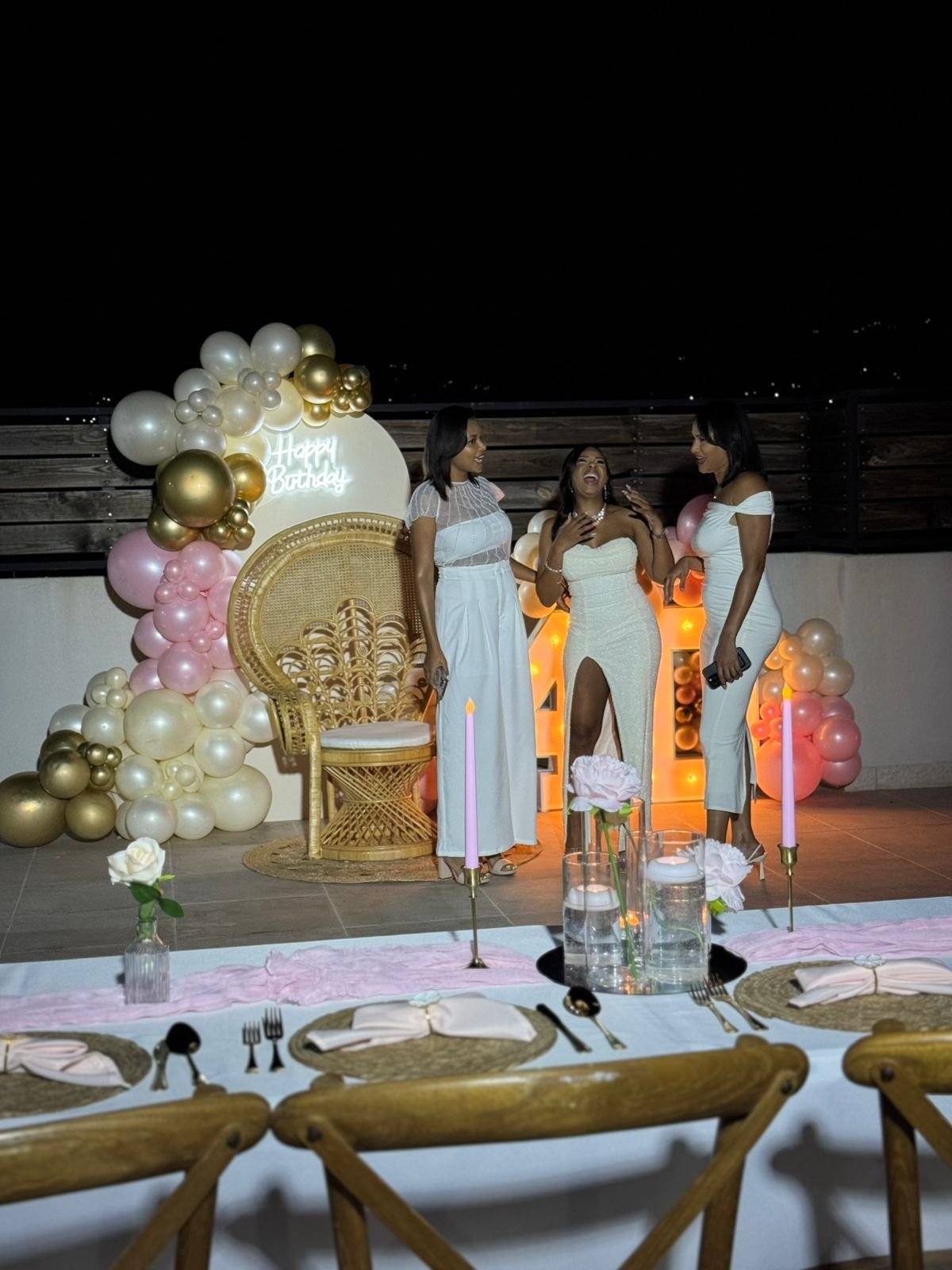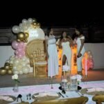 Guests in elegant white attire pose by a beautifully decorated throne chair and floral arrangements at Dr Rasheka Brown’ Birthday. (Photo taken: December 6, 2025)